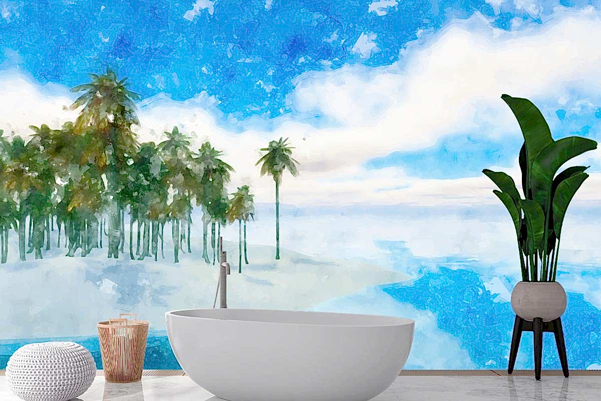 Suluboya Yaz Tropikal Arka Plan Banyo Duvar Kağıdı